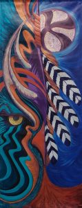 I saw owl speaking to me.? The next morning on a walk, I found a feather, probably not an owl feather, but it sure looks like one and I knew owl was talking to me.? My second painting came quickly, but not without it’s own times of frustration and second-guessing.? I almost painted over it, but decided to walk away and sleep on it.? Low and behold, it looked pretty good the next morning!? Guess the elves worked overnight.