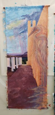 It kind of felt like I was on to something, but that something wasn’t strong enough yet.? I posted it to Facebook, to keep you all abreast of the fun I was having and I got some pretty positive responses.? Getting positive responses from an abstract painting was surprising to me, in itself.? Then along came another guide…my mother, in the form of a blue heron.? She always seems to show herself in the form of a blue heron, whether alive or in a photo or some other visual presence when I am about to step into something powerful and meaningful.? She tells me, “Go for it, Judo, I believe in you! You can do it!”.? I listen.? She’s always right.? My only goal for this visit to Sedona was to connect with the land, Native American spirit, and myself.? ?I saw a large sculpture of a blue heron and asked a local what was up with a blue heron in a kind of desert setting.? She told me that because Oak Creek runs through Sedona, Great Blues were everywhere.? OK.? I guess Mom was right.? My next painting needed a blue heron guide in it somehow.? Remember, I wanted to incorporate the land and Native American spirit?? Owl symbolizes wisdom, peace, strength and silence, with a watchful eye.? Blue Heron symbolizes self-reflection and inner knowing.? Bingo! But this actually didn’t come easily at first either.? My first rendition had nothing to do with blue heron.? But it did have a sense of self-reflection and spirituality.? Since my first painting of the chapel on the property was a hit, I thought I’d try a different view, with a monsoon sunset.? Painted it…felt nothing.? Liked the monsoon part.? Wasn’t a bad painting, if you like landscapes.? Just didn’t speak enough to me.? That’s when Blue Heron started whispering to me…”I’m in the chapel, come and get me.”.